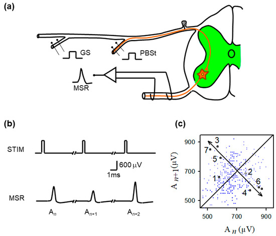 Experimental preparation, monosynaptic reflex recordings, and return-map structure of MSR variability. (a) Schematic of the in vivo spinal preparation used to examine monosynaptic reflex (MSR) dynamics. Group I afferents from the gastrocnemius (GS) or posterior biceps–semitendinosus (PBSt) nerves were electrically stimulated while MSRs were recorded extracellularly from the L6–L7 ventral roots. The afferent volley enters the dorsal horn and monosynaptically excites motoneurons (green region). The recorded MSR reflects the aggregate response of the motoneuron population to each identical stimulus pulse. (b) Representative sequence of MSRs evoked by constant-intensity GS stimulation. Despite identical stimulation pulses (STIM), successive MSRs exhibit substantial amplitude variability (labeled , , ), illustrating the intrinsic trial-to-trial fluctuations that constitute the target of chaos–control interventions. (c) Return map obtained from the MSR amplitudes ( plotted against ). Although small clusters of sequentially ordered points (1–7) transiently approach a common region before diverging, the overall distribution shows broad, irregular scattering, consistent with strong synaptic-driven variability rather than a stable, low-dimensional structure. The diagonal line marks unity; arrows highlight the brief approach-to-divergence trajectory characteristic of an unstable fixed point.