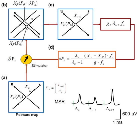 Schematic implementation of the OGY chaos–control algorithm applied to monosynaptic reflex fluctuations. (a) Construction of the Poincaré (return) map used to represent the system state on each trial. Consecutive monosynaptic reflex amplitudes form the embedded point in a two-dimensional state space, with the estimated unstable fixed point located at the intersection of the inferred stable (s) and unstable (u) manifolds. (b) Effect of introducing a small perturbation in stimulation intensity. A slight change in the control parameter shifts the system state relative to the manifolds of , revealing the local geometry of the dynamics and the direction of divergence along the unstable manifold. (c) Illustration of the OGY corrective step: using the estimated eigenstructure of the map, the next state is nudged toward the stable manifold of the fixed point, thereby attempting to counteract the natural tendency of trajectories to diverge. (d) Overview of the real-time control loop. The OGY algorithm computes the required perturbation for each trial and delivers it to the nerve stimulator, which adjusts the amplitude of the next afferent stimulus to stabilize the reflex response.