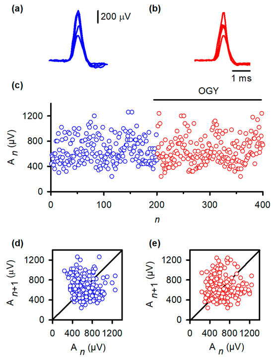 Return maps reinforced this conclusion. Under baseline conditions (Figure 3d), the relationship between An and An+1 formed a widely dispersed cloud, indicating substantial intrinsic variability. During OGY control (Figure 3e), the map remained virtually identical: points did not collapse toward the fixed point, nor did the system exhibit any reduction in the spread of trajectories. These results indicate that, although correctly directed by the OGY rules, the perturbations were ineffective at overcoming the strong endogenous fluctuations that dominate the MSR pathway in vivo.