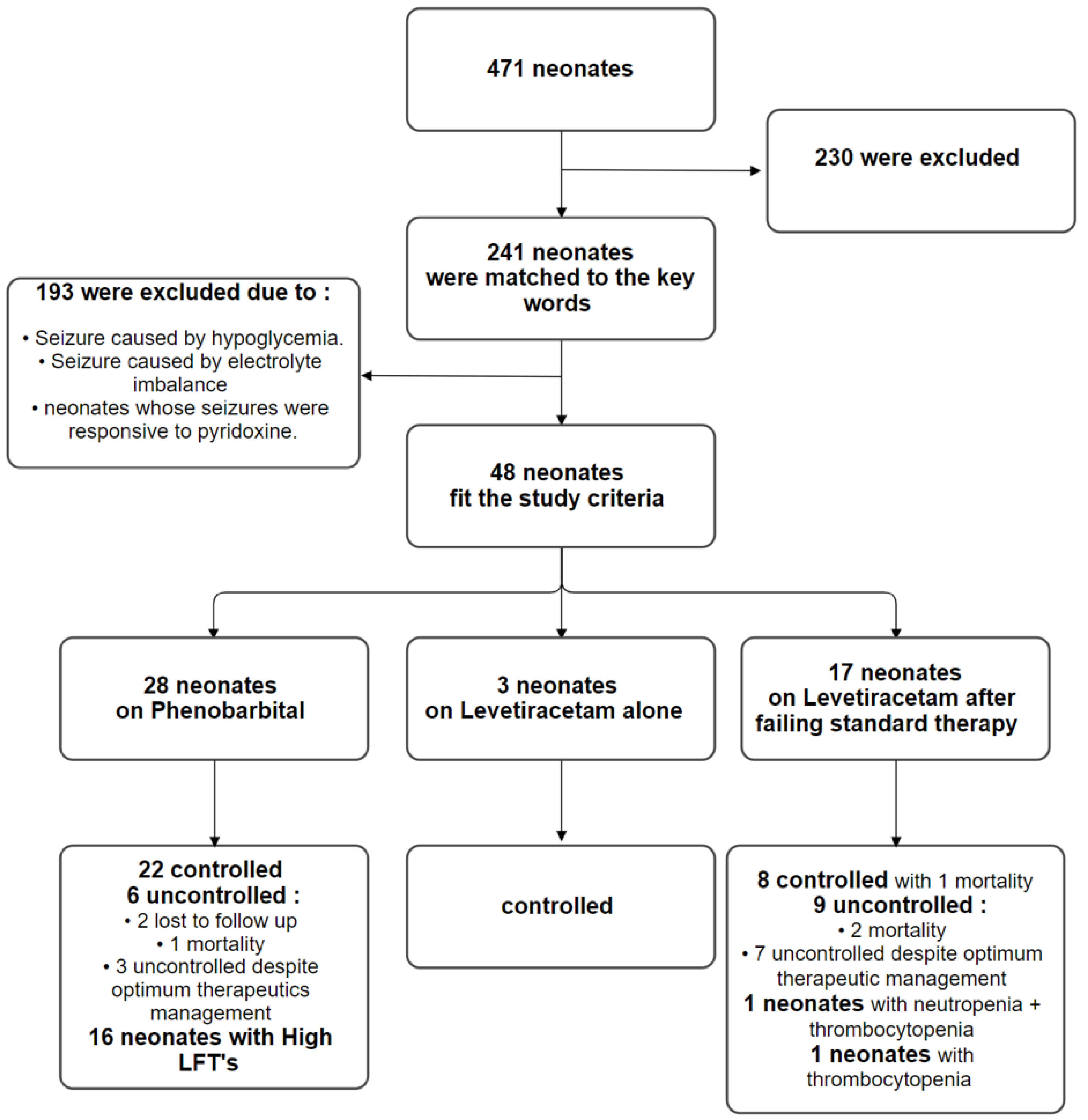 The second arm included 20 patients (41.66%) who received LEV for seizure management after failing standard therapy with PB. In this group, three patients (15%) received LEV as initial management for their seizures. Within this intervention cohort, eleven neonates (55%) were controlled with one incidence of mortality, and nine neonates (45%) were uncontrolled due to optimum therapeutic management or mortality occurring prior to maintaining seizure freedom. Regarding adverse events in the LEV group, two neonates (10%) experienced side effects after receiving LEV, mainly neutropenia and/or thrombocytopenia (Figure 1). Notably, status epilepticus was not reported in either arm during the study period.