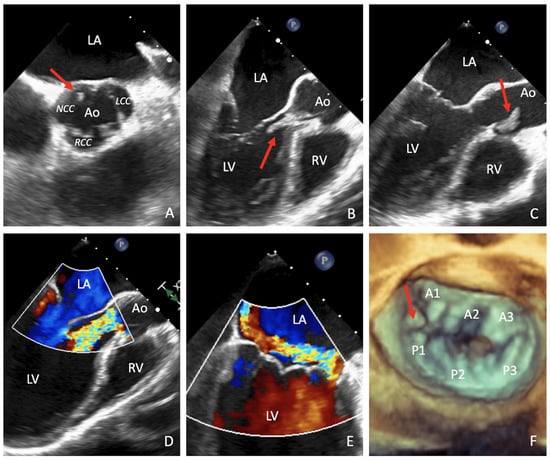 Pre-operative trans-oesophageal echocardiography (TOE). Four-chambers TOE showing a motile vegetation (red arrow) on the non-coronary cusp of the aortic valve (A) during diastole (B) and systole (C), resulting in severe aortic regurgitation (AR) (D); Color doppler (E) and four-dimensional (4D) TOE (F) reported a concomitant severe MR due to P1 flail.