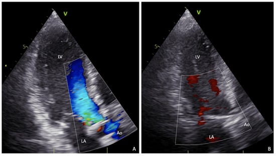 Post-operative transthoracic echocardiography (TTE). Long-axis three-chambers view in late diastole (A) and systole (B) at color doppler TTE showing no paravalvular leak (PVL) of the AVR and good result of the mitral valve repair.