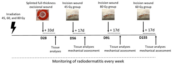 Figure 1. Schematic of the experimental design and timeline of the animal studies. Each week after irradiation, macroscopic images were taken to monitor radiodermatitis progression and resolution. For excisional surgery experiments, two full-thickness excisional wounds were created on the back of CD-1 mice on day 28 after irradiation. Healing was followed visually, and the scar tissues were harvested and processed 33 days later. For the incisional wound study, incisions were made as soon as the skin appeared macroscopically healed for each group, namely on day 56 for the group that received 45 Gy, day 91 for the 80 Gy group, and on day 155 for the group that received 60 Gy (for each time point, a control non-irradiated group was also included). The scar tissues were harvested 17 days after the incisions were made and characterized using mechanical assays.