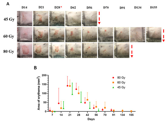 Figure 2. Macroscopic imaging following irradiation and scoring of acute/late side effects. (A) Representative images of the appearance of the skin as function of the irradiation dose delivered. * Indicates the date of surgery for excisional wounds created in the irradiated zones and normal skin. Red arrows indicate the day of surgery for incisional wounds. (B) Graphical representation of the skin surface area presenting redness over a 22-week period (mean data and standard deviation for n = 7–8 mice per group).