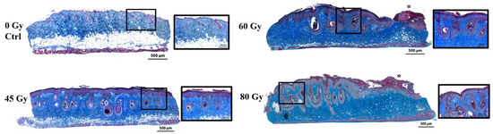 Figure 3. Impact of increasing doses of radiation on the histological appearance of murine skin. Masson’s trichrome staining of transverse sections of non-irradiated and irradiated skin 28 days after irradiation. Bars = 500 µm. Images on the right are magnifications of the area delimited by the black boxes. Bars = 200 µm. * indicates hyperkeratosis.