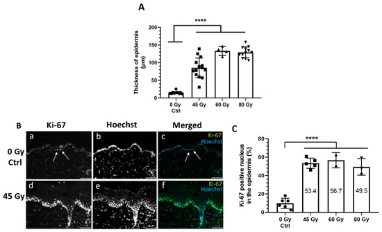 Figure 4. Epidermal thickness and Ki-67 expression are increased in murine irradiated epidermis 28 days after irradiation. (A) Mean thickness of the epidermal compartment. Statistics: mean ± SD. n = 4–16 mice/group. (B) Immunolabeling for Ki-67 on a representative skin biopsy 28 days after irradiation with a 45 Gy dose in comparison to normal skin. Nuclei are stained with Hoechst. Bars = 100 µm. (C) Quantification reveals a significant increase of Ki-67 positive nuclei in the epidermis of irradiated compared to non-irradiated skin. Statistics: mean ± SD. n = 2–6 mice/group, One-way ANOVA with Dunnett’s multiple comparisons test **** p < 0.0001.