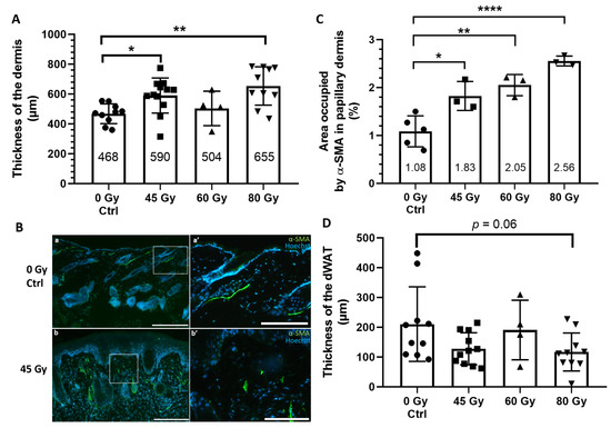 Figure 5. Impact on connective tissue compartments 28 days after irradiation. (A) Mean thickness of dermis. (B) Immunolabeling for α-SMA on (a) a representative skin biopsy of non-irradiated control skin and (b) 28 days after irradiation with a 45 Gy radiation dose. (a‘,b’) are magnifications of the areas delimited by the white boxes in (a,b). Bars (a,b) = 500 μm; (a’,b’) = 200 μm. Nuclei were stained with Hoechst. (C) Quantification of α-SMA labeling associated with the presence of myofibroblasts in the papillary dermis 28 days after irradiation. (D) Mean thickness of the dermal white adipose tissue layer (dWAT). Statistics: mean ± SD. n = 3–16 mice/group, One-way ANOVA with Dunnett’s multiple comparison tests * p < 0.05, ** p < 0.01, **** p < 0.0001.