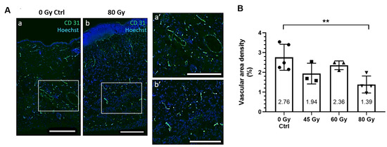 Figure 6. Vascularity is altered in irradiated skin. (A) Immunolabeling for CD31 on a representative skin section of (a) non-irradiated control skin, and (b) 80 Gy irradiated skin 28 days after irradiation. Nuclei are stained with Hoechst. (a’,b’) are magnifications of the areas delimited by the white boxes in (a,b). Bars = 200 µm. (B) Vascular area density determined from the quantification of CD31-positive structures present in the dermis. Statistics: mean ± SD. n = 3–5 mice/group, One-way ANOVA with Dunnett’s multiple comparisons test ** p < 0.01.