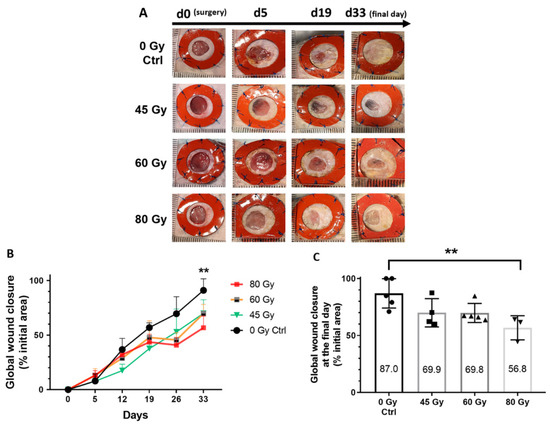 Figure 7. Healing kinetics of excisional wounds created on irradiated skin at the acute stage. (A) Macroscopic images showing the reduction in wound size over the course of 33 days after surgery. Measurements of global wound closure were made on such images for each wound, using ImageJ software. (B) Kinetics and (C) Global final wound closure values as a function of the dose received, reflecting the severity of the radiodermatitis that developed during four weeks prior to excisional surgery and splinting of the wounds. Statistics: mean ± SD. n = 3–5 mice/group, One-way ANOVA with Dunnett’s multiple comparisons test ** p < 0.01. * Symbol indicates significance between control and other groups.