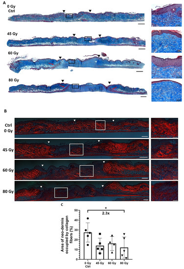 Tissue samples were harvested and fixed in a 3.7% formaldehyde solution before processing and embedding in paraffin. This was performed at various time-points: on the day of excisional surgery (8 mm punch biopsies at 4 weeks after irradiation), on the final day of analysis (day 33 of healing), as well as on the day of incisional surgery for a subset of two–three mice per time point (see Figure 1 for time points). Sections of 5 µm were made with the microtome (RM2245, Leica, Concord, ON, Canada) and stained with Masson’s trichrome or according to a Picrosirius red protocol [43]. Photographs were taken with an AxioCam Icc1 camera mounted on a Zeiss AxioObserver.Z1 microscope (Zeiss Canada, Toronto, ON, Canada) and polarized light was used for viewing the Picrosirius red staining. Scale bars were added to the images using Photoshop (version CC2018, Adobe Systems Inc., San Jose, CA, USA). The thickness of the skin compartments four weeks post-irradiation was measured from these images using ImageJ software for four to sixteen mice per group (one sample per mouse, with five to six measurements per sample). Images were acquired in a semi-blinded manner. At least five to six zones were systematically measured across the whole length of the tissues section to obtain a representative average thickness for each sample. The number of mice analyzed is higher for the 0, 45, and 80 Gy groups since mice from additional independent and comparable experiments were also included. The surface occupied by stained collagen fibers within the entire granulation tissue area visible on Picrosirius-stained transversal sections was quantified using ImageJ for four to five mice per group. The granulation area was identified by the absence of hair follicles and glands on scar tissue.