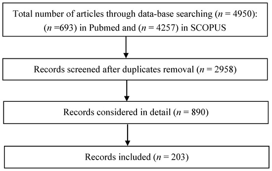 After searching the databases, the total number of records was 4950, divided for PubMed (n = 693) and SCOPUS (n = 4257), respectively. The title and abstract were screened, and duplicates and nonrelevant records were removed, as summarized in Figure 1.