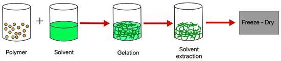 Thermally-induced phase separation (TIPS) allows us to obtain homogeneous porous scaffolds [111]. During this process, a row polymer is dissolved in an appropriate solvent; then, there is phase separation between the polymer-rich phase (which becomes a gel) and the polymer-poor phase (the solvent); the solvent is extracted from the gel, and the gel is frozen and dried. In this way, the polymer-rich phase forms a porous 3D matrix [112] (Figure 2).