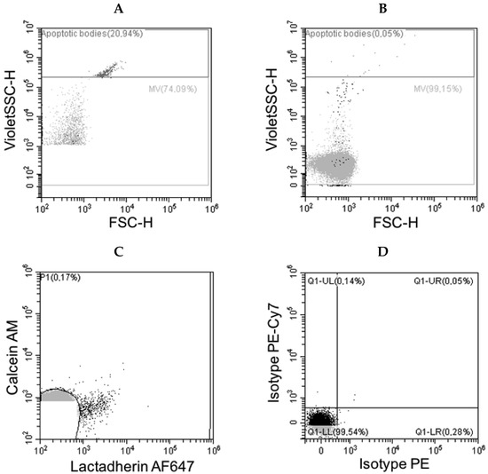 Detection of blood cell derived EVs was facilitated by means of lactadherin (AF647 labelled, CellSystems/Biotechnology, Troisdorf, Germany) labeling, which detects phosphatidylserine (PS) translocated from the inner to the outer membrane leaflet and is present on at least a subpopulation of EVs [11]. To identify EVs which are PS negative, additional staining using calcein AM (Calcein Green, ThermoFisher Scientific, Waltham, MA, USA) was performed. Calcein AM is taken up from EVs and converted by esterases to Calcein. Calcein can be excited by 488 nm laser light and emits light in a range of around 515 nm wavelength. Lactadherin in combination together with calcein served as trigger parameters to further identify EVs from different cell sources. The following monoclonal antibodies were used to describe subsets of extracellular vesicles: Anti-CD41 (PE-Cy7, Beckman Coulter, Brea, CA, USA) mAb against platelets origin, anti-CD14 mAb (PE-Cy7, Biolegend, San Diego, CA, USA) against monocyte origin, CD15 (PE-Cy7, Biolegend, San Diego, CA, USA) against myeloid origin and CD235a (PE, Beckman Coulter, Brea, CA, USA) against red blood cell origin [10,12]. To avoid the detection of antibody aggregates by flow cytometry, antibodies were centrifuged before the staining procedure at 17,000 g for 10 min. The optimal concentration of antibodies was preliminary determined in antibody titration experiments. For staining of EVs a daily stock solution of centrifuged antibodies was prepared. Samples were pre-diluted in phosphate-buffered salt solution (PBS) and stained on ice with an aliquot of the antibodies stock solution for 1.5 h. Afterwards EVs were incubated with lactadherin and calcein AM for additional 30 min on ice and fixed with paraformaldehyde to minimize the staining of free plasma esterases. The stained samples were then measured by flow cytometry within 1.5 h. As depicted in Figure 1A, 1 µm size silica beads were first measured using the VSSC as a trigger channel to estimate the approximate size of the measured EVs. A detergent-lysed plasma sample stained with isotype antibodies was then used as a negative control from the pregated EV population (Figure 1B,C). In order to detect particles labeled with antibodies, a combination of trigger channels was set to calcein or lactadherin, depending on which signal gives a positive signal first. The entirety of the lactadherin and/or calcein positive signals were then used for further analysis of the specific antibody stains. The results are given in events/µL and show the concentration in the salvaged blood sample calculated from the dilution factor of the measured sample.
