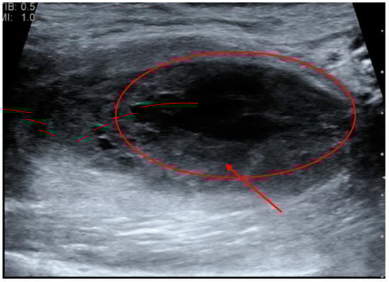 Patient presenting with multiple complaints including numbness predominantly in the median nerve distribution, inability to flex the second through fifth digits completely and inability to flex completely at the elbow. Ultrasonography identified a large hematoma in the arm after the patient had phlebotomy while on anticoagulants. The hematoma is directly adjacent to the anterior interosseous branch of the median nerve causing compression and the clinical symptoms observed. Within the figure, the circle identifies the hematoma and the arrow identifies the anterior interosseous nerve.
