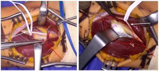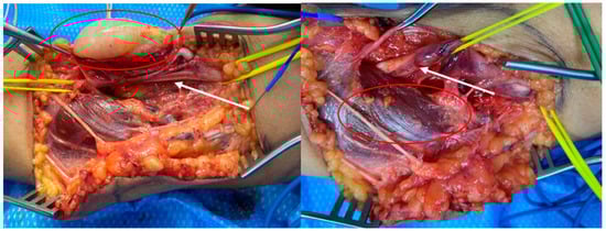 Identification of the posterior interosseous nerve (red arrows) deep to the extensor carpi radialis brevis during release of the posterior interosseous nerve for radial tunnel syndrome. The sensory branch of the radial nerve is observed branching proximal to the radial tunnel (white arrows). The circle in the right image encompasses the supinator fascia which is released to decompress the radial tunnel.