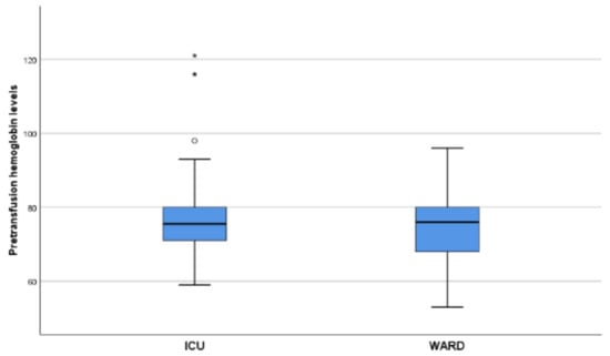 The COVID-19 pandemic aroused many health, economic and social problems in society. The need for blood and blood products depends on the number of inhabitants, number of hospital beds and types of medical services provided in the country. The requirements in Serbia are approximately 40 blood donors per 1000 inhabitants (4%) [], which was difficult to achieve even before the COVID-19 crisis. A decline in the number of donations was expected with the start of the pandemic with the government epidemiological measures to control the spread of infection. In the first year of the COVID-19 pandemic, a 20% decline in blood donations was published by the main national blood establishment []. University Hospital Medical Center Bezanijska Kosa is a general hospital, with 360 acute hospital beds allocated for internal medicine, surgery and oncology inpatient care. In the pre-pandemic period, ICU patients were mostly critically ill patients requiring surgery or recovering from surgery. Our hospital was particularly affected by the pandemic by becoming a dedicated ‘COVID-19’ hospital with a drastic decline or absence of elective surgeries and other medical admissions. Consequently, blood use decreased for indications other than the treatment of COVID-19 cases. In 2019, in the same period of time as in our study, out of the total of 3557 hospitalized patients, 445 (12.5%) needed transfusion, for which a total of 1187 RBC was issued (of which, 23.5% in the ICU and 76.5% in other wards, including the operating theater). Comparing this to 5.9% of transfused patients in 2020, the number of patients who needed transfusion was halved and total number of RBC doses issued in our hospital was 304 (of which 45.7% was in the ICU and 54.3% was in wards, including the operating theater).