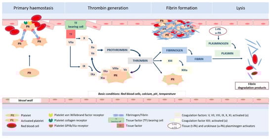 The fibrinolytic system is activated by thrombin. A series of cascading reactions leads to the conversion of plasminogen into the active plasmin, which lyses fibrin []. Plasminogen is activated with the tissue plasminogen activator (t-PA) and urokinase plasminogen activator (u-PA). The reactions are controlled by a number of cofactors, signalling molecules, and inhibitors. The extent of fibrinolysis is determined by the structure and strength of the clots []. The fibrin fibre density, factor XIII crosslinking, incorporated platelets, and RBCs reduce the clot permeability and make clots more resistant to lysis []. Fragile clots are more susceptible to fibrinolysis and bleeding.
