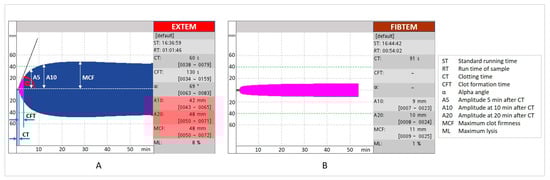 Different VET assays synergistically assess specific parts of haemostasis. Clot-related tests are able to detect fibrinogen disorder, platelet dysfunction, and hyperfibrinolysis. The kinetics of fibrin polymerisation and crosslinking are expressed by the alpha angle. The alpha angle is the angle between the line in the middle of the trace and tangential to the body of the VET trace. A reduced angle indicates a lack of fibrinogen. The strength or firmness of the clot is expressed by the amplitudes in the extrinsic thromboelastometry (EXTEM) and fibrin-based thromboelastometry tests (FIBTEM). Amplitudes at different time points are described by A5–A30 (A5 is the amplitude 5 min after coagulation time (CT), and A10 is the amplitude 10 min after CT). The maximal clot strength is expressed as the maximum amplitude (MA) and the maximum clot firmness (MCF) for the TEG and ROTEM, respectively. A low EXTEM MCF indicates a weak clot as a result of decreased fibrinogen, a decreased platelet count and/or function, fibrin polymerisation disorders, or low activity of factor XIII. An example of the ROTEM test results can be seen in Figure 2.