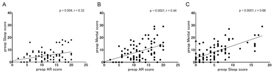 Correlations between preoperative AR, sleep, and mental scores in all the subjects. (A) correlation between AR and sleep scores, (B) correlation between AR and mental scores, (C) correlation between sleep and mental scores. Significant correlations among AR, sleep, and mental scores were observed with the Spearman rank correlation (p = 0.004, r = 0.32 for AR and sleep scores; p < 0.0001, r = 0.44 for AR and mental scores; p < 0.0001, r = 0.66 for sleep and mental scores).