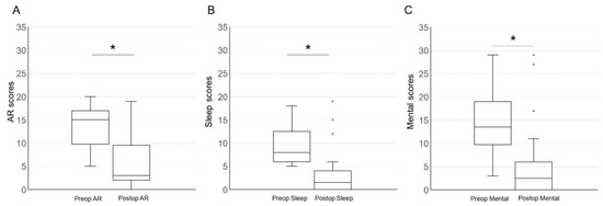 Box plots of preoperative and postoperative AR (A), sleep (B), and mental scores (C) in patients with both sleep and mental disorders. Differences between the preoperative and postoperative scores for each parameter were statistically significant at p < 0.0001 using the Wilcoxon rank test (*).