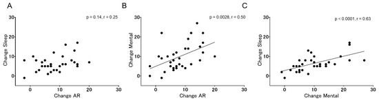 Correlations between changes in AR scores and those in sleep scores (A), between changes in AR scores and those in mental scores (B), and between changes in sleep scores and those in mental scores (C). A significant correlation was identified between AR and mental scores (p = 0.0028, r = 0.50) or between sleep and mental scores (p < 0.0001, r = 0.63) with Spearman rank correlation.