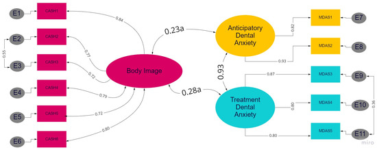 Following that, we built a testing model using structural equations modeling (SEM). The major thrust of this study was to concentrate on the relationship between body image dissatisfaction and dental anxiety. We construed dental anxiety into two components: anticipatory (Items #1–3 of MDAS) and treatment (Items #4–5 of MDAS). Hence, our SEM approach was to specify latent variables of these psychological constructs. Body image dissatisfaction was considered to influence reported dental anxiety. We used a maximum likelihood estimator and interrogated the modification indices for significantly correlated errors, to consider relieving the constraint of assuming independent errors after examining theoretical reasoning. Models that surpassed conventional fit indices of CFI > 0.95 and RMSEA < 0.10 were considered worthy of interpretation. Our a priori investigation of note was to inspect the strength of association of the latent variable body image dissatisfaction to anticipatory and treatment dental anxiety. A sensitivity analysis of re-running the model using robust standard errors was planned to correct for distribution concerns within raw variables. All models were adjusted for gender and age. Figure 1 was made online (www.miro.com, accessed on 12 January 2022). Data were analyzed with STATA and IBM SPSS (ver. 27) except for Steiger’s z which was calculated by the following module (see Lee & Preacher, 2013 for further information).