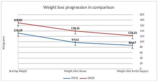 In the time of pandemic, obesity has not stopped its chronic effects affecting a large portion of the world’s population and, even more, it was a major risk factor for those who developed serious complications after a COVID-19 infection [,,]. In order to offer a safe, feasible and simple surgical solution, laparoscopic sleeve gastrectomy (LSG), originally a component of biliopancreatic diversion with duodenal switch (BPD-DS), became the most commonly performed procedure in bariatric surgery []. Despite the improvement occurring with LSG in terms of metabolic syndrome, long-term failure rates are up to 64% []. According to the American Society for Metabolic and Bariatric Surgery (ASMBS) preoperative surgery is intended to collect corrective, reversal and conversion procedures []; the latter is especially increasing all over the world due to insufficient weight loss and weight regain in the long term []. It is hard to define how weight regain should be described after LSG, and in the literature a large variety of definitions are offered. It is reasonable to consider an increase of at least 10 kg from nadir weight [] as a criterion for a re-operation, but also other measures, like BMI or percent excess weight loss (EWL) could guide the choice, giving meaningful data supporting the weight loss failure. A proper distinction between two types of weight loss failure has been proposed by the International Bariatric Club []: insufficient weight loss, described as an EWL of <50% at 18 months and progressive weight regain, occurring after reaching a peak of EWL > 50%. Despite criteria and definition, a focus in the literature about proposed causes of weight regain after LSG includes initial sleeve size, sleeve dilation, increased ghrelin levels, inadequate follow-up support and maladaptive lifestyle behaviors []. Even with several predictors for weight regain after SG, the lack of a consistent, worldwide shared definition [] implies that every bariatric center chooses his own strategy to manage those patients. Currently Roux-en-Y gastric bypass (RYGB) is recognized worldwide as the golden standard for revisional procedures, but it is not that easy, feasible and safe as LSG. Revisional RYGB has been described by current studies [,,,] as a harbinger of early complications such as leakage, bleeding and infection (occurring in 11.8–16.6% of surgeries and up to 8% of these cases need further intervention) and long-term complications like internal herniation (occurring in 3.3–4.9% of surgeries). However, the conversion of LSG to RYGB can be successfully performed laparoscopically with a low rate of conversion and reasonable complication profile, as described by Landreaneau et al. [], in the same manner for complications from LSG or to enhance weight loss. Rutledge [], looking for a viable alternative, proposed One Anastomosis Gastric Bypass (OAGB) with the purpose of reaching a shorter operation time, reversibility and technical simplicity. In comparison, as a primary procedure, OAGB is not as effective as RYGB, reporting 60.1% vs. 72.9% excess weight loss five years after surgery, respectively, whereas the complication rate is 3.2% vs. 1.8%, respectively [,,]. Evidently the lower rate of complications and the simplicity of OAGB could drive the choice for revisional procedures, with a large support in the literature. [,,,,,]. The aim of this study was to suggest, according to our experience, which revisional procedure could be more effective for weight regain after LSG, taking into account that all of those revisional procedures were performed by certified and experienced bariatric surgeons in the Adipositas Zentrum Klinikum Stuttgart Bad Cannstatt.