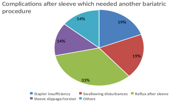 A retrospective analysis of patients undergoing re-operative bariatric surgery after a primary sleeve gastrectomy was performed considering a time frame from January 2010 to December 2019. The patients included in our study had a primary sleeve gastrectomy and afterwards underwent revisional surgery (RYGB or OAGB). The indications for conversion were evaluated for weight loss failure/weight regain and other type of complications—reflux after sleeve, swallowing disturbances and the combinations of others.