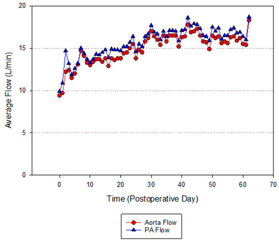 Daily average for hourly blood flow through the aorta and pulmonary artery (PA).