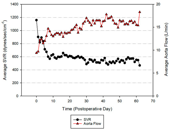 Daily average for hourly systemic vascular resistance (SVR) and blood flow through the aorta.