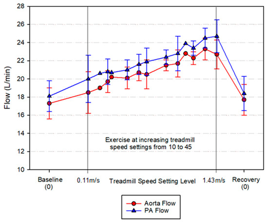Aorta and pulmonary artery (PA) blood flow during treadmill exercise evaluations. Flow is displayed at baseline and recovery, as well as during exercise at increasing treadmill speed settings from 0.11 m/s to 1.43 m/s.