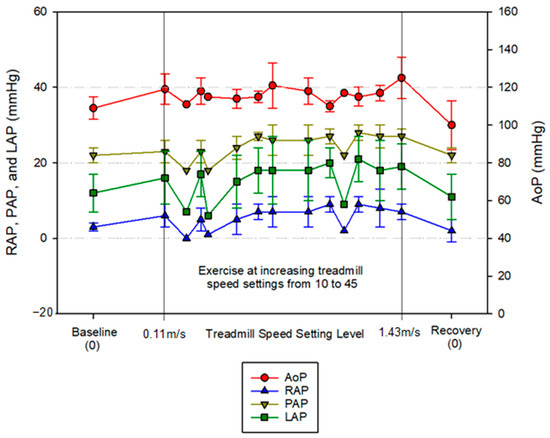 In Figure 5, the relationship between the physiologic pressures (AoP, RAP, PAP, and LAP) and exercise is shown. As expected, during the treadmill exercise, an overall increase in the pressures was observed, as well as a decrease in the values during recovery. The increase in the pressures follows the same principles explained above—a sum of neurohormonal adaptive mechanisms. The decrease in the pressures is a direct consequence of the abrupt cessation of the activity, causing arterial vasodilation and decreased venous return [9,10].
