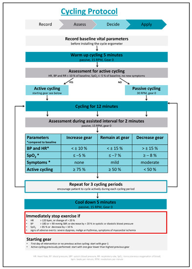 Standard safety criteria will be assessed prior to initiating cycling treatments. The cycling is supervised by medically trained research staff. The patients are placed in a semi-recumbent position. The patient’s heart rate and transcutaneous oxygen saturation of blood (SpO2) is monitored continuously; the systolic and diastolic blood pressure is be measured non-invasively in 2.5-min intervals. The in-bed cycling is performed actively with graded increasing resistance or passively, according to our protocol (Figure 1). There are 3 cycling periods for 12 min each with a 2-min assisted interval in-between the cycling periods, allowing the patient to rest. Before and after the in-bed cycling, there is a 5-min warm-up, as well as a 5-min cool-down. In between the cycling periods, the resistance of the ergometer will be adjusted according to the physiologic response of the patient, as shown in Figure 1.