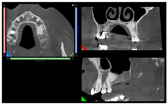 Two-dimensional (2D) X-ray is the first level X-ray examination in dentistry. When further investigation is needed, such as volumetric data, a three-dimensional (3D) X-ray is required to improve the diagnosis. Computed tomography was first developed in 1972, but its technology uses large and expensive devices that exposes patients to relatively high doses of radiation [1]. The X-ray that offers 3D images with relatively low costs and radiation doses in a more compact device is the cone beam computed tomography (CBCT). CBCT has been utilized in dentistry since the second half of 1990 [2], and its radiation doses fall into a range from 19 µSv to 1073 µSv [3]. CBCT is prescribed in dentistry for evaluating conditions such as impacted teeth, apical lesions, and diseases of the jaws. In implant dentistry, CBCT is used for presurgical diagnosis, preoperative planning, and preoperative assessments [4]. Dental implants improve the performance of oral prosthetic rehabilitation, but they involve invasive surgery with flaps and hemorrhagic risks. Guided surgery allows more stable and comfortable prosthetic rehabilitation even to high-bleeding-risk (HBR) patients [5]. Thanks to 3D images, guided surgery allows us to plan and execute, in many cases, a flapless surgery. Sometimes it helps the immediate loading of the implants placed [6,7]. Drill guides are performed by the technician who receives the 3D X-ray exam; thus, communication is fundamental for agreeing on treatment goals and surgical procedures. Moreover, it has been shown that the precision of CBCT images and the quality of the software used are discriminating for the performance of the drill guide. Compared with freehand implants, navigated implants allow highly accurate implant placement; a margin of −2 mm is necessary due to a deviation of more than 1 mm [8]. The diagnosis and therapy in oral pathology and, generally, in all branches of medicine [9] have become more accurate and more precise [10]. This is due to not only technical but also technological and cognitive improvements. In this way, professions become more specialized, needing more specific updating. The solution is to improve the communication between different practitioners studying the same clinical case to cure the pathologies patients ask us to. In this article, the case of a multidisciplinary approach is reported in order to find a better and minimally invasive diagnosis and treatment, thanks to the multidisciplinary discussion.