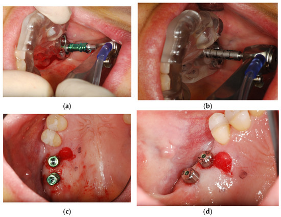 Oral surgery: (a) placement of implants; (b) bone biopsy; (c) occlusal view after implants’ placement and osteotomy; (d) final view, with healing screws placed.