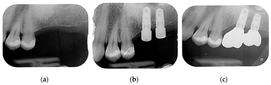 Juxta-gingival view of the surgical site: (a) preoperative view; (b) implants’ placement; (c) prosthetic on implants.