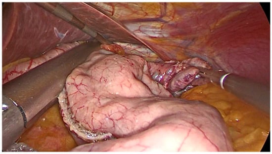 Intraoperative image of the gastric diverticulum after dissection of the greater curvature.