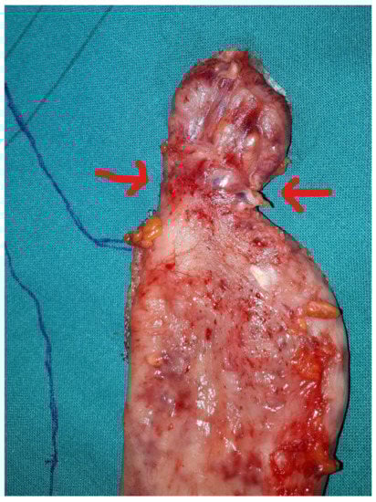 Gastric specimen after sleeve gastrectomy. Red arrows: Neck of the diverticulum.