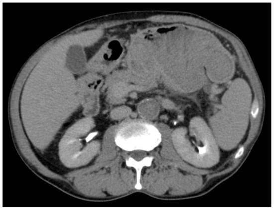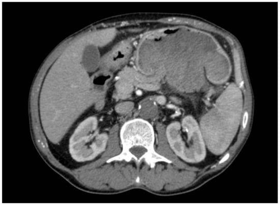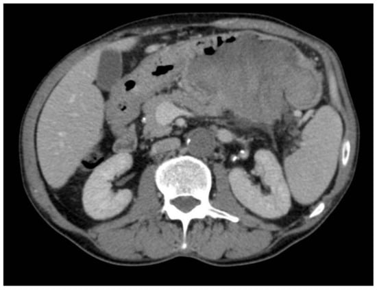 As PACC is often large and exophytic, infiltration sometimes occurs through the extension of the intrapancreatic ducts or the main pancreatic duct, which can be associated with a vascular infiltration, resulting in vascular thrombosis (such as the portal vein or splenic vein) [,,]. In other cases, the infiltration may be of greater magnitude and extend to the adjacent organs, as in our case where there was an invasion of the posterior gastric wall.