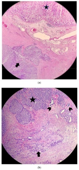 (a) Above, gastric mucosa (star); below, gastric wall with neoplastic infiltration (arrow) (H&E, 100×). (b) The lesion (star) infiltrating the pancreatic parenchyma (arrow) which shows moderate atrophy. Occasional calcifications are also present (small arrows) (H&E 100×).