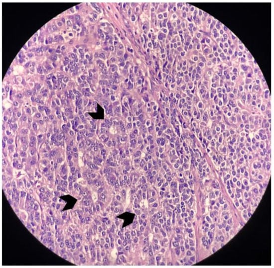 Magnified image that highlights a neoplasm with occasional acinar formation (small arrows) (H&E, 400×).