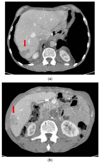 (a) Follow-up CT scan after 9 months with increased size and number of liver metastases in S7. (b) Follow-up CT scan after 9 months with increased size and number of liver metastases in S6.