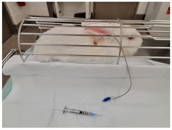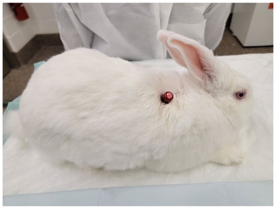 Routine post-operative care was followed focusing on thermoregulation, intravenous fluid administration, analgesia, pain assessment, and documentation of physiological parameters every 30–60 min. Immediately following surgery, the rabbit was moved to a heated recovery cage and administered meloxicam (Covetrus, Dublin, OH, USA), 1 mg/kg SQ. Intravenous fluids were discontinued once the rabbit was sternal and moving about the cage. An intramuscular dose of buprenorphine (Reckitt Benckiser Healthcare, North Chesterfield, VA, USA) at 0.03 mg/kg was administered at the end of the day. Meloxicam (Covetrus, Dublin, OH, USA) 1 mg/kg SQ was continued for three post-operative days. Each rabbit was evaluated daily for incisional healing, appetite, fecal and urine output, signs of pain or distress, and activity level. All animals healed within ten to fourteen days of the procedure.