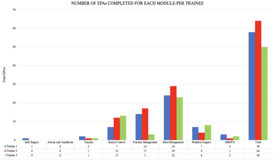 Burn management had the most EPAs completed by trainees (76 EPAs), followed by fracture management (34 EPAs) and source control (32 EPAs). Burn management was the only module in which all trainees were evaluated for their surgical skills, followed by the source control and orthopedics modules. Module two, airway and basic anesthesia, was the only module with zero recorded EPAs (Figure 1).
