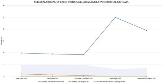 Mortality rates, represented over time as 5-month averages, superimposed with 5-month averages of surgical caseloads (% of total hospital encounters), from January 2019–January 2021 at Aweil State Hospital.