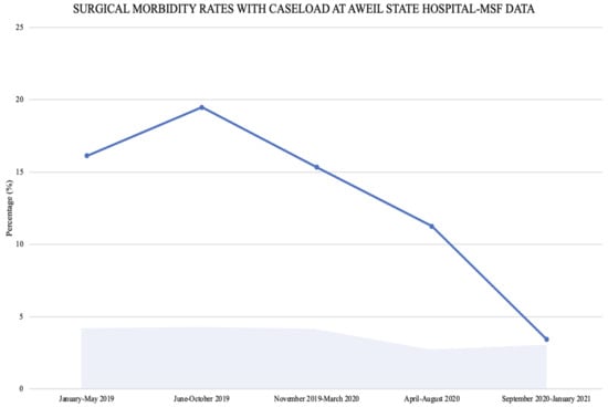 Morbidity rates, represented over time as 5-month averages, superimposed with 5-month averages of surgical caseloads (% of total hospital encounters), from January 2019–January 2021 at Aweil State Hospital.