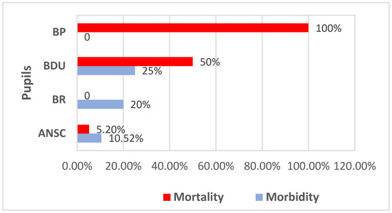 Mortality and morbidity outcome in relation with pupil examination at admission in the emergency room. BP, midposition and fixed pupils; BDU, bilateral minimally reactive dilated pupils; BR, bilateral reactive pupils; ANSC, anisocoria.