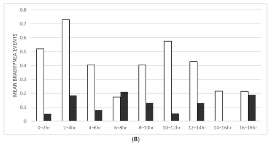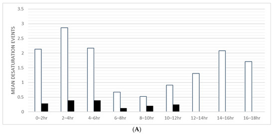 OSA patients had a progressive reduction in the frequency of RE during the first few hours after admission to the floor (Figure 1A). This peak for OSA patients from 0 to 6 h was significantly different from the trough from 6 to 10 h when the desaturation events of the periods were compared (p = 0.008). In addition, desaturations increased significantly for a second peak between 14 and 16 h compared to the trough between 6 and 10 h (p = 0.045). For bradypnea, a similar trend is seen; however, a comparison of the peak at 8 to 14 h and the trough at 6 to 8 h did not show any significant differences (p = 0.078) (Figure 1B). These previous two peaks are particularly evident in the eight patients with a high PRODIGY score, all of whom had OSA. However, the exact comparisons in this group with high PRODIGY scores were insignificant (p = 0.371, 0.289, respectively, for desaturations and bradypnea). The distribution during the overnight monitoring did not reveal increased doses of opioid administration in concert with increases in RE. In addition, the opiate doses administered at night to OSA and non-OSA patients were not different (Figure 2).