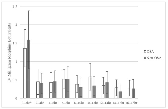 Average MME (IV morphine) for OSA and non-OSA patients every 2 h after leaving PACU: OSA 52 patients, non-OSA 38 patients (* = significantly different MME from 0 to 2 h when compared to 2–18 h, p < 0.001; error bars represent a 95% confidence interval).