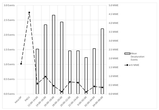 Most patients with OSA received the first surgery of the day at a 7:30 a.m. induction time, leading to arrival on the general care floor by 17:00. This group of 39 patients could be evaluated by the absolute clock time for the onset of their RE, and it was re-analyzed separately (Figure 3). These patients saw a peak in desaturation events from 16:00 to 18:00 and a second surge from 04:00 to 06:00 the morning following surgery. This later peak again appears unrelated to opioid usage, as most opioids were administered while still in PACU, as seen in Figure 3, with most opiates on the general care floor given within the first 2 h only. The correlation coefficient between mean MME and respiratory events from 12:00 to 06:00 in the 2 h intervals was 0.049, demonstrating the lack of relationship. The trend shown in these patients matches those seen in Figure 1A.